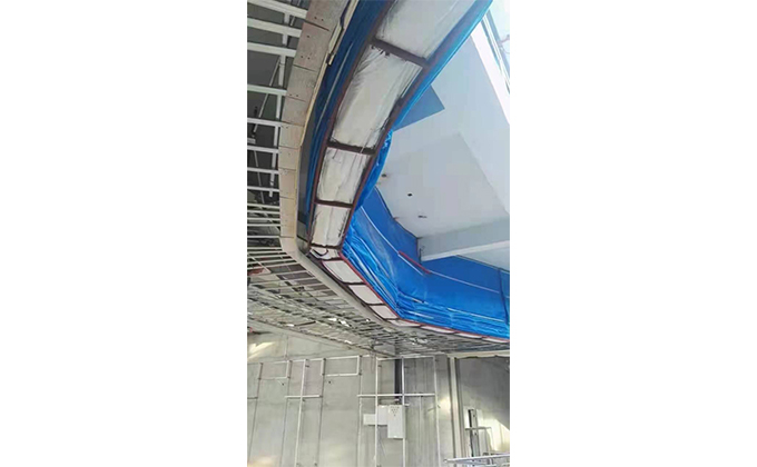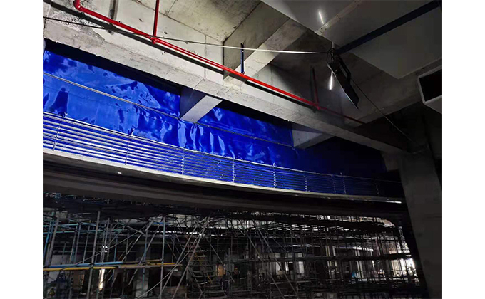擋煙垂簾垂壁根據(jù)設(shè)計(jì)要求和現(xiàn)場(chǎng)實(shí)際情況采取如下施工順序:首先,搭設(shè)腳手架一放線一打眼--上脹栓一焊骨架。第二,吊件一安裝骨架…
